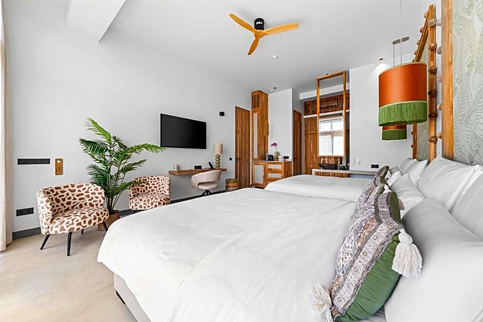 Air-conditioned suite overlooking an inner courtyard. Includes flat-screen TV, a refrigerator, and a modern bathroom.